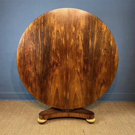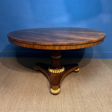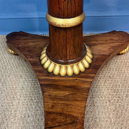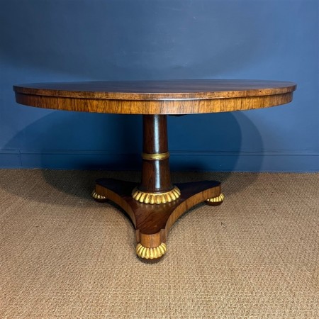 A Regency rosewood and parcel gilt centre table circa 1820 by Wilkinsons of Ludgate Hill with beautifully figured timber to the top on a ring turned column and tripod base.