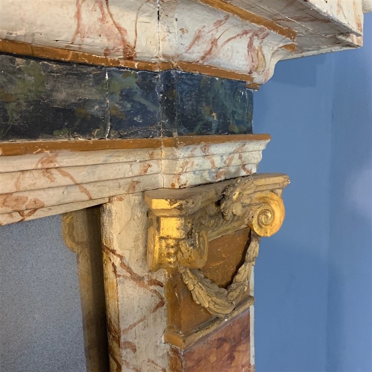 A magnificent large late 18th c Italian painted and gilt classical mirror circa 1780 with the original decoration simulating different specimen marbles. The plate of later date.