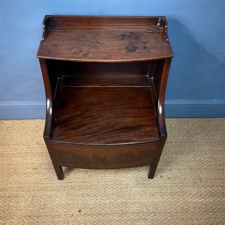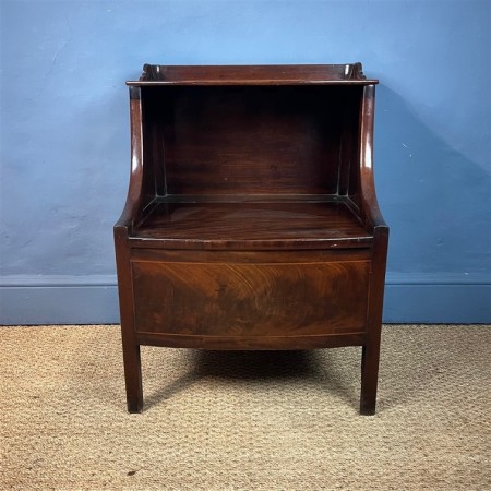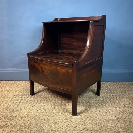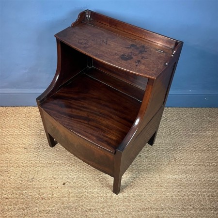 A George 111 mahogany bow fronted Lancashire bedside commode of traditional form with hinged shelf and hinged pot cover below