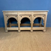 A Gothic bleached oak console or side table circa 1880 with triple arched frieze on large bun supports