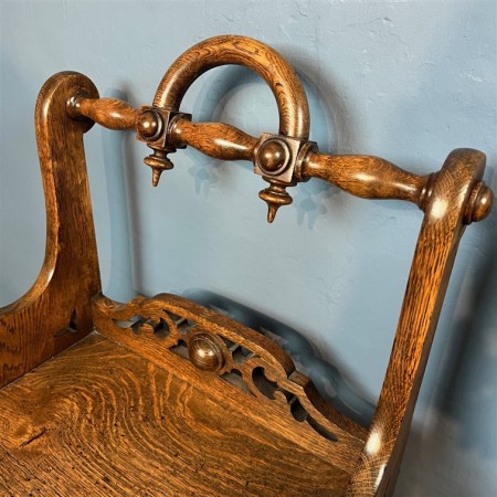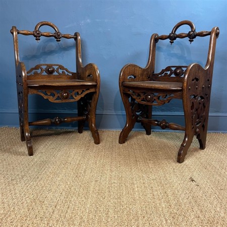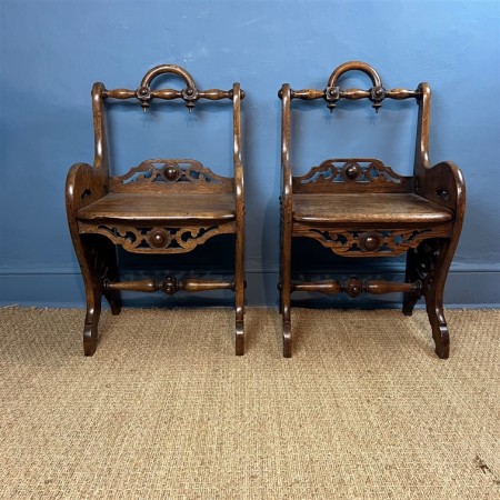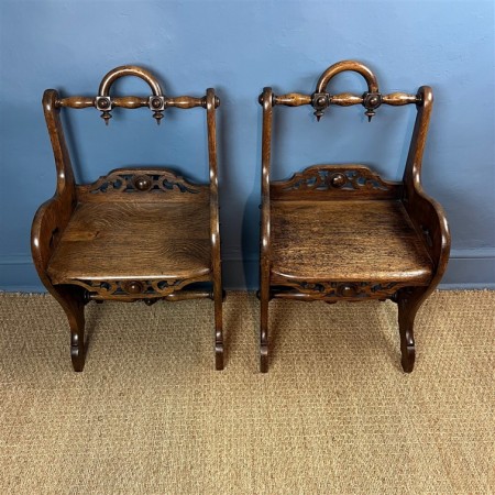 An unusual pair of mid 19th century Oak Hall Chairs to a designed by Anthony Salvin an excellent solid original condition.