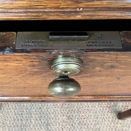 A rare Edwardian oak drinks cabinet circa 1910 possibly by the Army and Navy Company with 3 lockable compartments the Bramah locks stamped JT Needs 109 New Bond St late Bramah 126 Piccadilly .. 4 original glass decanters all perfect and a detachable oak and brass handled tray on top.