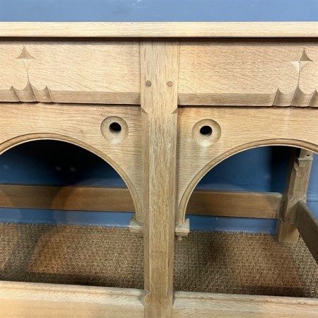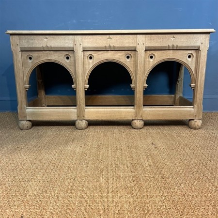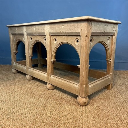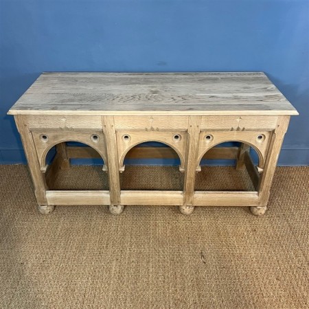 A Gothic bleached oak console or side table circa 1880 with triple arched frieze on large bun supports