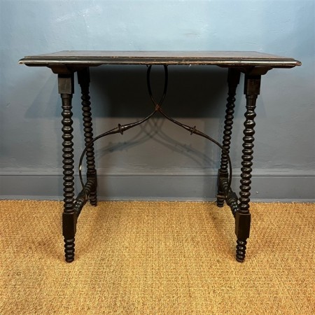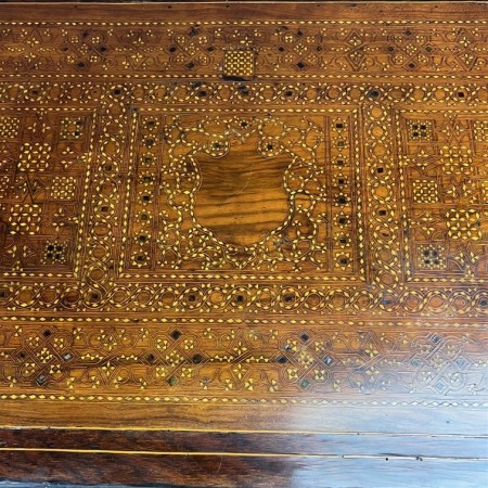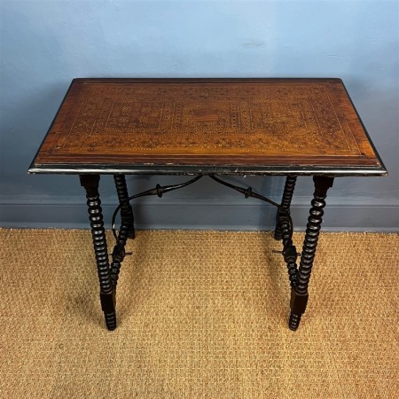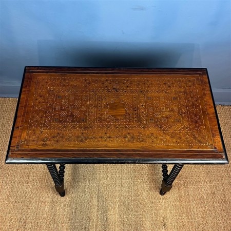 A late 17th century Indo Portuguese marquetry tabletop on ebonised 19th century bobbin twist stand