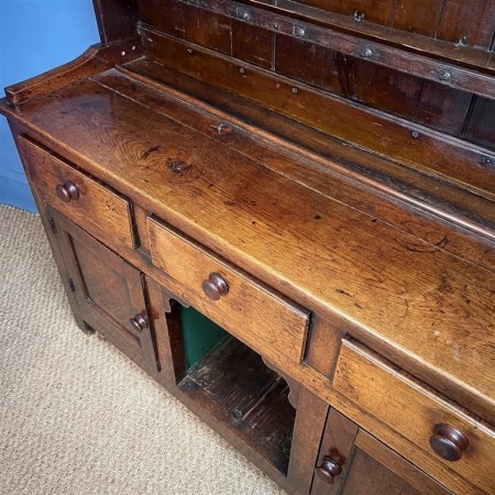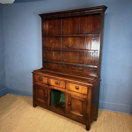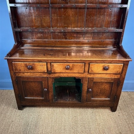 A late 18th century Oak Dresser of diminutive size and with a warm lovely colour and patina. The rack with three wide back boards above three frieze drawers above a pair of cupboard doors with a central dog kennel with the original blue painted back