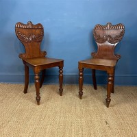 A pair of William IV mahogany hall chairs circa 1825 with leaf carved and gadrooned backs on tulip carved turned legs.