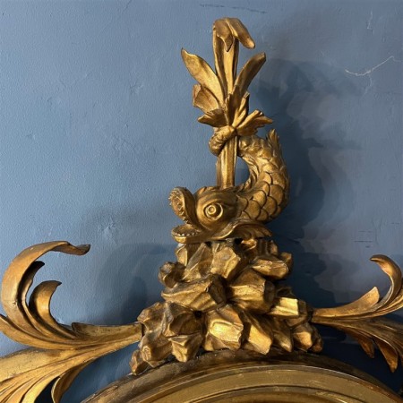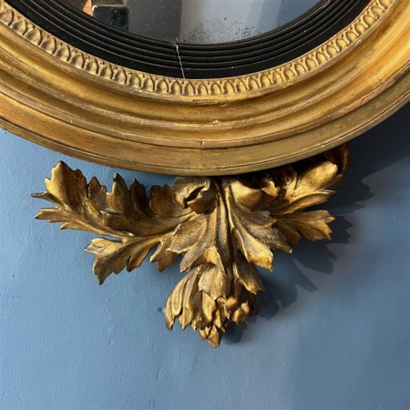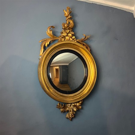 A small Regency giltwood convex mirror circa 1820 with a plain frame surmounted by scrolls and centred with a dolphin the bottom with scrolled leafage . Retaining its original gilding and silvered mercury plate.