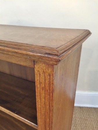 A late Victorian oak open bookcase in mid honey coloured oak on plinth base with two adjustable shelves.