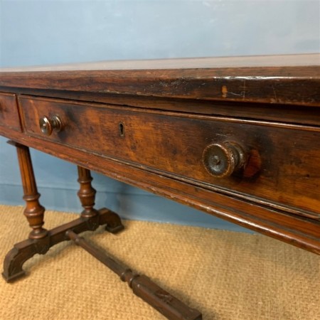 A Victorian Gothic oak writing table circa 1880 with tan leather top above two frieze drawers on dual fluted end supports united by a stretcher.