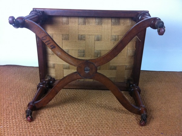 A well carved Victorian carved walnut stool c 1880 in original condition with turned fluted legs united by a wavy stretcher.