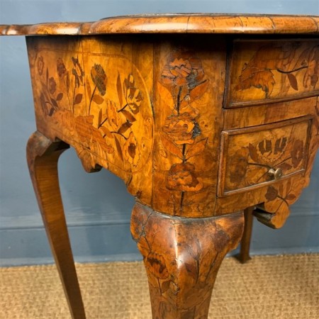 A mid-18th Century Dutch walnut and marquetry side table circa 1750. The serpentine sided top inlaid with a basket of flowers surrounded by birds and foliage the flowers inlaid with bone, ebony and mother of pearl above a similarly inlaid bow-fronted frieze drawer with two small drawers below inlaid with butterflies on four cabriole legs all inlaid with marquetry on shaped pad feet.