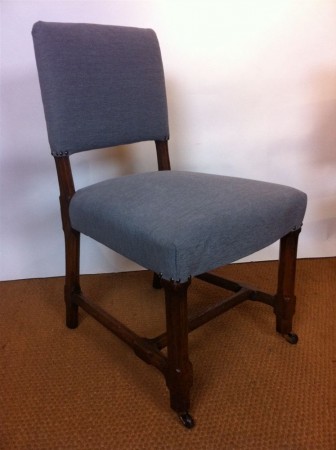 These chairs have been re covered in a blue/ grey cotton linen union fabric .