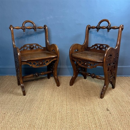 An unusual pair of mid 19th century Oak Hall Chairs to a designed by Anthony Salvin an excellent solid original condition.