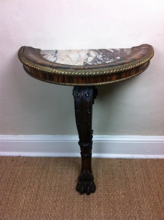 An unusual George IV goncales alves and walnut console table c 1825 the dished gilt metal mounted half round top with inset marble on a scrolled walnut leg with leaf carving to the knee and terminating in a claw foot.