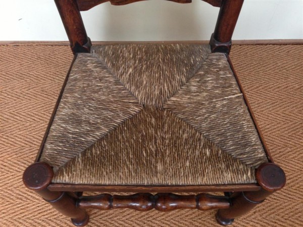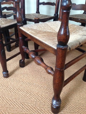 A good set of 8 late 18th c Ash North Country ladderback chairs c 1800 comprising 2 arms and 6 singles. In excellent condition with good rushing on all chairs and in firm order all round these chairs have a wonderful rich patination and would complement a good refectory or large gateleg table.