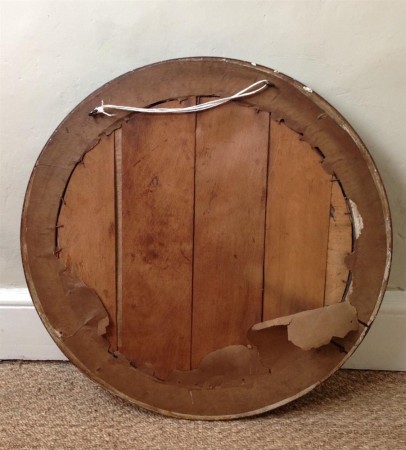 A large late Victorian circular ebonised mirror c 1890 with classical moulded decoration on a ring turned border with original bevelled plate and pine backboards