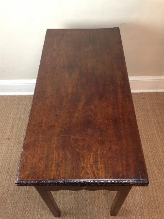 A rare Chippendale period carved mahogany fold over tea table c 1765 in dense well figured and patinated Cuban mahogany with florette carved edge above a central carved frieze with a drawer to the side on square chamfered legs.
