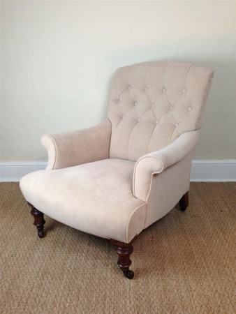A Victorian Howard type mahogany Bridgewater armchair c 1880 on turned legs with brass capping and castors. The chair is in good solid condition and has been recently upholstered in a neutral fabric.